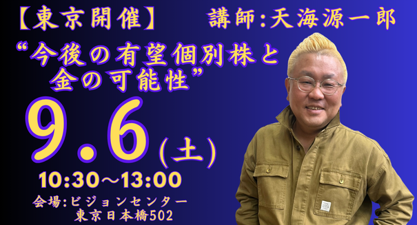 【東京開催・無料セミナー】 株式評論家の天海源一郎氏が登壇!『今後の有望個別株と金の可能性』