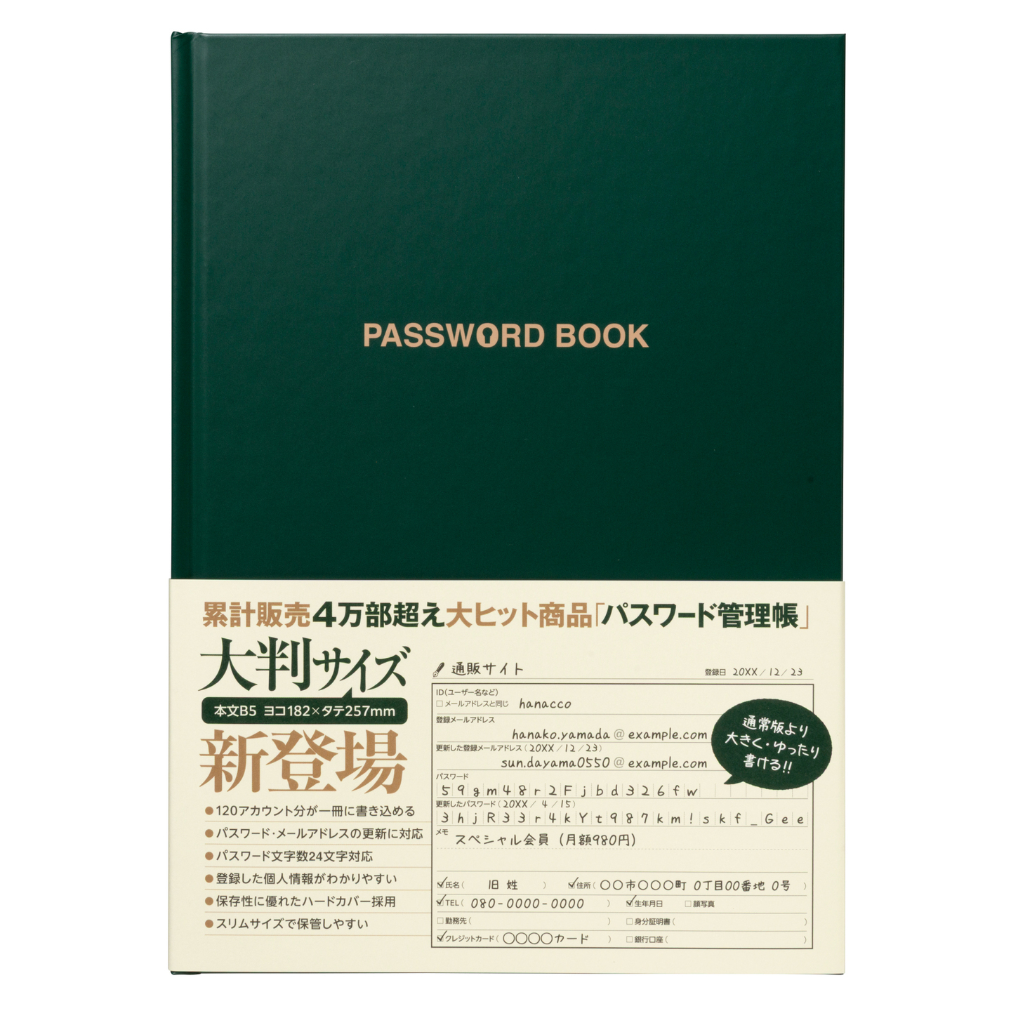 シニア世代のための新サイズ。累計4万部突破の人気シリーズ「パスワード管理帳 」に大きくて見やすい大判サイズが新登場!