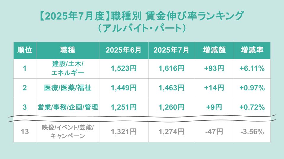 求人サイト主要9媒体から雇用形態別に分析!アルバイト・パートでは建設系が前月比+6.11%で1位【2025年7月度 職種別 賃金伸び率ランキング】