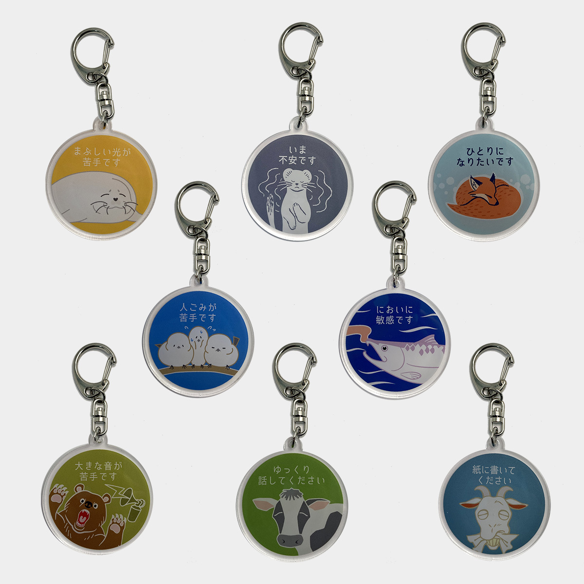 「トリセツ!アクリルキーホルダー」は、発達障害などによりコミュニケーションに困難を抱える方が、自身の状態を周囲にやさしく伝えられるアイテムです。