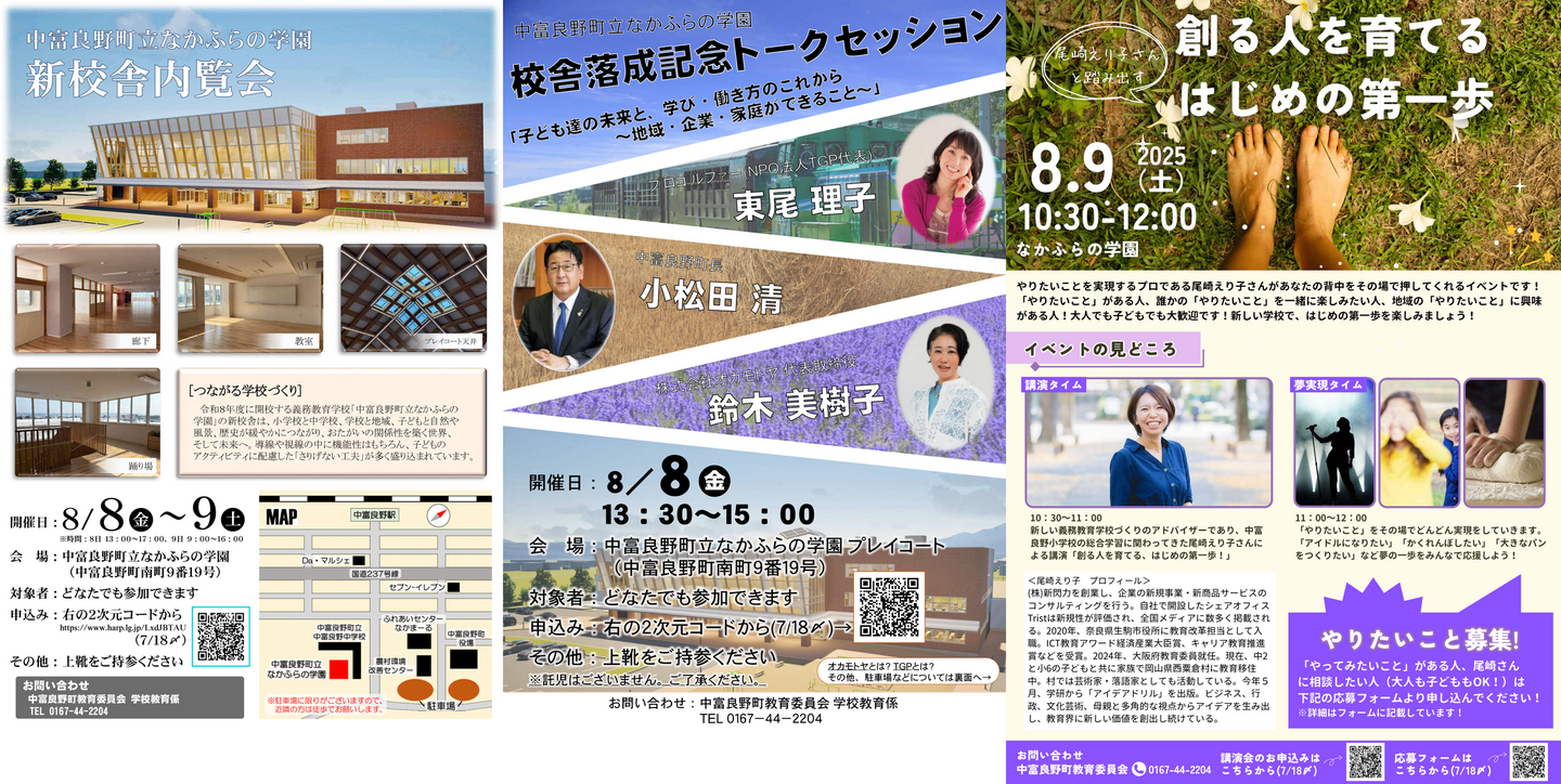 8日㈮にはリプロダクティブヘルスを学ぶ機会を創出するNPO法人TGP代表理事・プロゴルファーの東尾理子氏、中富良野町と「教育推進における連携と協力に関する協定」を締結している株式会社オカモトヤ代表取締役社長の鈴木美樹子氏と、小松田清町長とのトークイベントを開催。9日㈯には株式会社新閃力代表取締役・新しい義務教育学校づくりのアドバイザーの尾崎えり子氏の講演と夢実現タイムが行われます。
