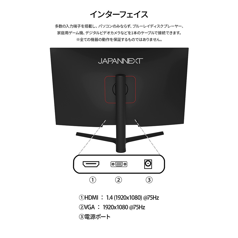 インターフェイスは、HDMI 1.4 x1 (75Hz)、VGA x1 (75Hz)を装備し、様々な機器との接続が可能です。VGA端子を搭載していますので以前から使用しているPCなどとの接続も可能です。※本製品は、オーディオ入力端子非搭載モデルとなります。