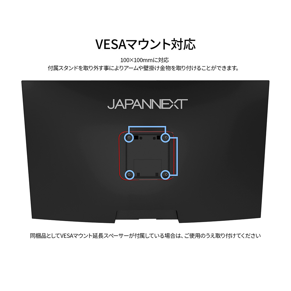 100x100mmのVESAマウントに対応しているので、別売のモニターアームやモニタースタンドなどへの取り付けが可能です。スピーカーは搭載しておりません。