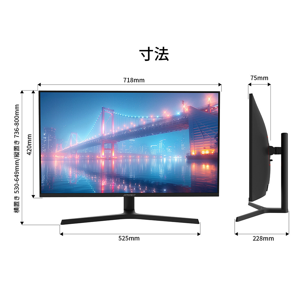 | 外形サイズ(スタンド付) | 高さ(横置時)530-649mmx幅718mmx奥行き228mm |