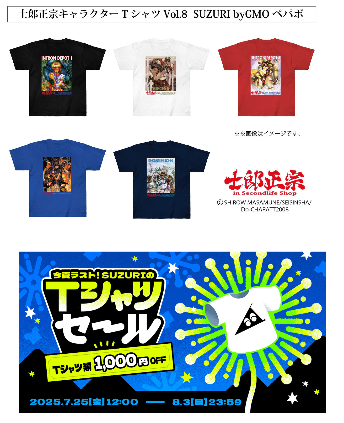 【士郎正宗inセカンドライフショップ】士郎正宗、漫画家メジャーデビュー40周年&ショップ17周年記念Tシャツ、「士郎正宗キャラクターTシャツVol.8」「SUZURI byGMOペパボ」 サイトにて、2025年7月31日(木)0時から販売開始!