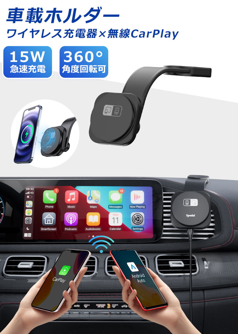 磁石車載ホルダー+ワイヤレス充電+無線CarPlay、1台3役のカー用品