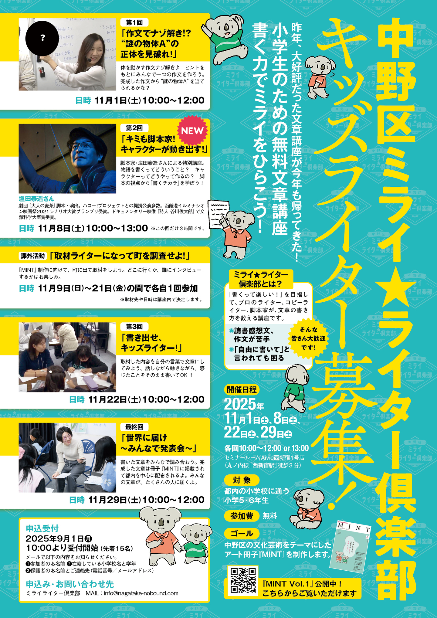 「ミライ★ライター倶楽部」は、小学生を対象に、「書くことの楽しさ」を体感できる創作文章講座を展開しています。学校教育では扱いきれない「自由な表現」や「自己発信の喜び」に焦点を当て、プロのライターや脚本家によるワークショップで、子どもたちの創造力と自己肯定感を育みます。講座の仕上げとして、参加児童の作品を収録したアート冊子『MINT』を制作。地域アートや文化へのまなざしをまとめた一冊として、完成後は都内を中心に配布し、子どもたちの声を社会へ届けていきます。今後は、こうした実践的なライティング教育を、誰もが当たり前に受けられる「未来のスタンダード」として広めていくことを目指しています。