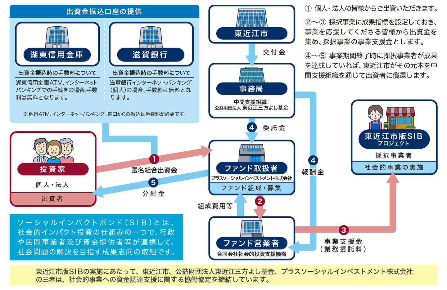 東近江市版SIBは、公益財団法人東近江三方よし基金、湖東信用金庫及びPSIの協定のもと、地域課題の解決に向けて社会的投資と行政補助金改革を組み合わせた事業です。「地域活性化、コミュニティビジネス起業支援分野まちづくり分野」において国内で初めてSIBを導入し、モデルケースとして注目を浴びています。