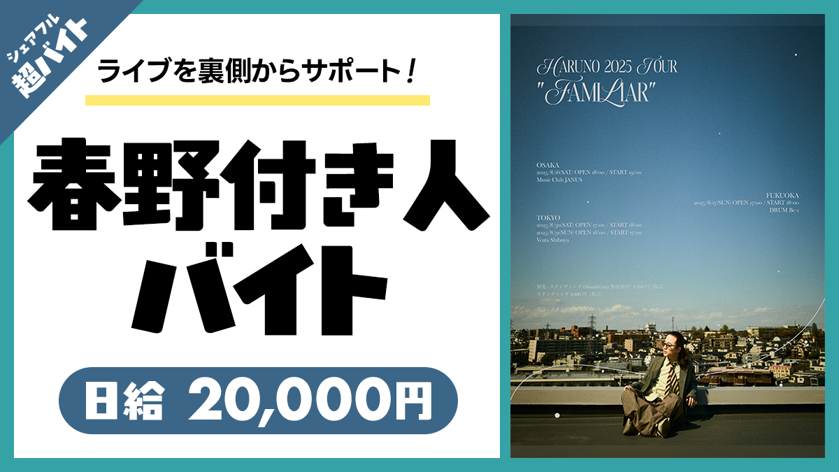 「はたらいて、笑おう。」をビジョンに掲げるパーソルグループのスキマバイトアプリ『シェアフル』やSaaSシフト管理サービス『シェアフルシフト』、就業実績を活用した人材紹介サービス『シェアフルエージェント』などを提供するシェアフル株式会社(本社:東京都港区、代表取締役社長:横井 聡)は、2025年8月30日(土)にVeats Shibuyaにて行われるシンガーソングライター春野のワンマンツアー「Haruno 2025 Tour "Familiar"」にて”春野付き人”の超バイトを募集します。
