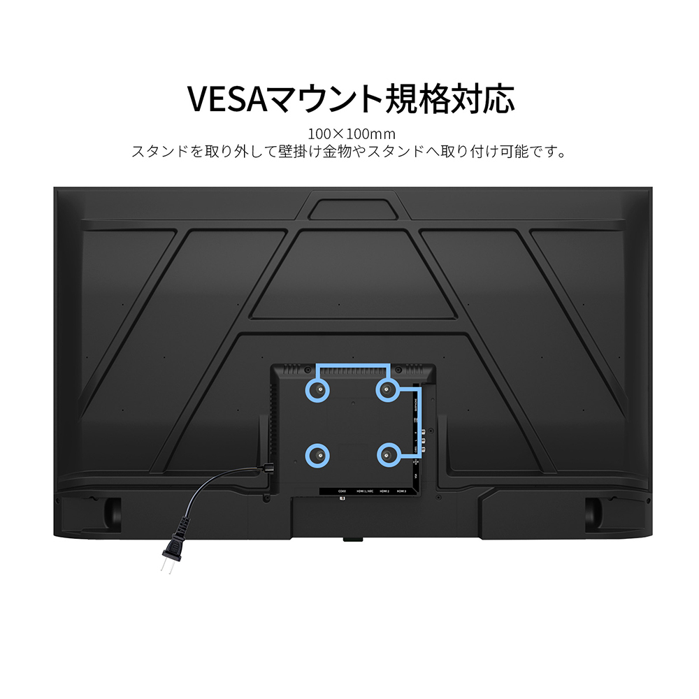 100x100mmのVESAマウントに対応しますので、対応の壁掛け金具やスタンドなどに取り付けが可能です。8Wx2のスピーカーを搭載します。便利なリモコンを同梱。USBからの再生操作や、メニュー操作、音量調整、入力ソース切り替えなどを行うことが可能です。