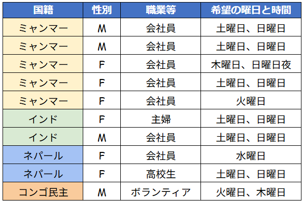 「日本語トークセッション」(2期)では、ミャンマー人、インド人、ネパール人、コンゴ民主人の合計10人がエントリーして皆さんの参加を待っています。全員が、身近な話題についてある程度会話ができる(日本語能力試験・JLPTでいうN3に相当する)日本語会話力のレベルです。日常的な会話の練習に慣れたら、実際に日本で話される日本語会話にチャレンジしてみてください。