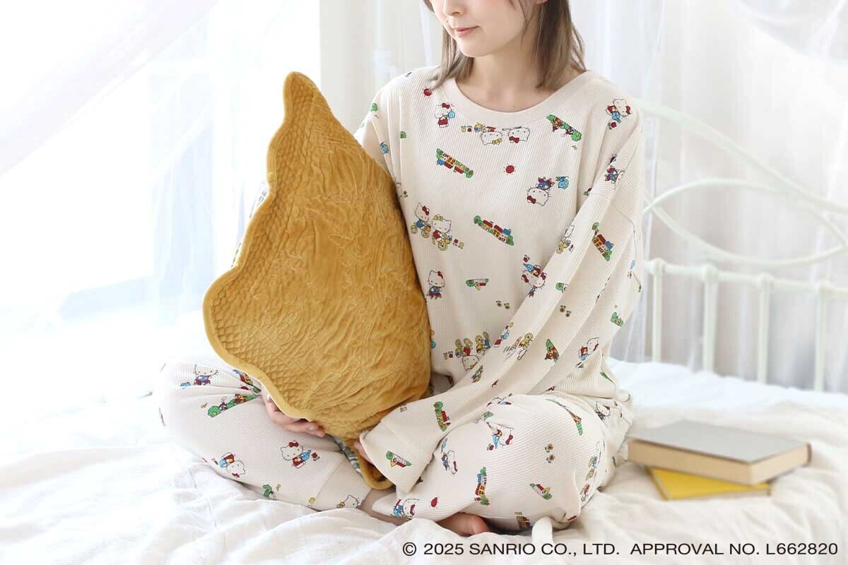 1974年に誕生して以来、世界中で愛され続けている「ハローキティ」。ワッフル素材のルームウェアには、サイクリングをしたり、水やりをしたりと、毎日をごきげんに楽しむキティちゃんの姿が描かれています。どこか懐かしさを感じるデザインは、柄違いの2タイプ。オフホワイトとクリームの2色展開で、それぞれ異なるキティちゃんの柄が楽しめます。ごきげんなキティちゃんと一緒に、おうち時間をもっとハッピーに過ごせそうな一着です。