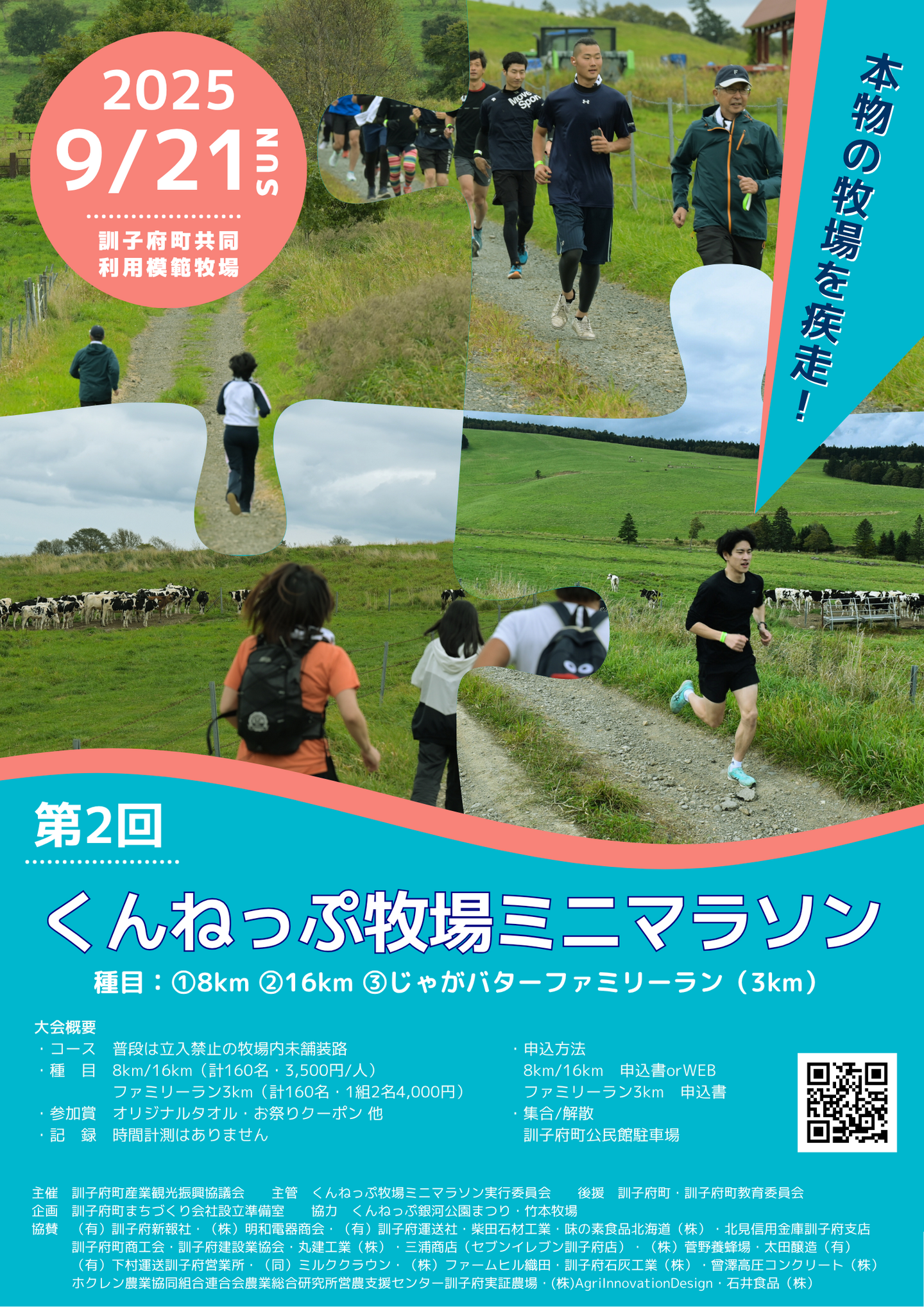 北海道オホーツクエリア・訓子府町で「第2回くんねっぷ牧場ミニマラソン」を2025年9月21日(日)に開催します。町が有する600haの広大な町営牧場「共同利用模範牧場」を舞台に、一般立入禁止の本物の牧場を走れる貴重な機会です。