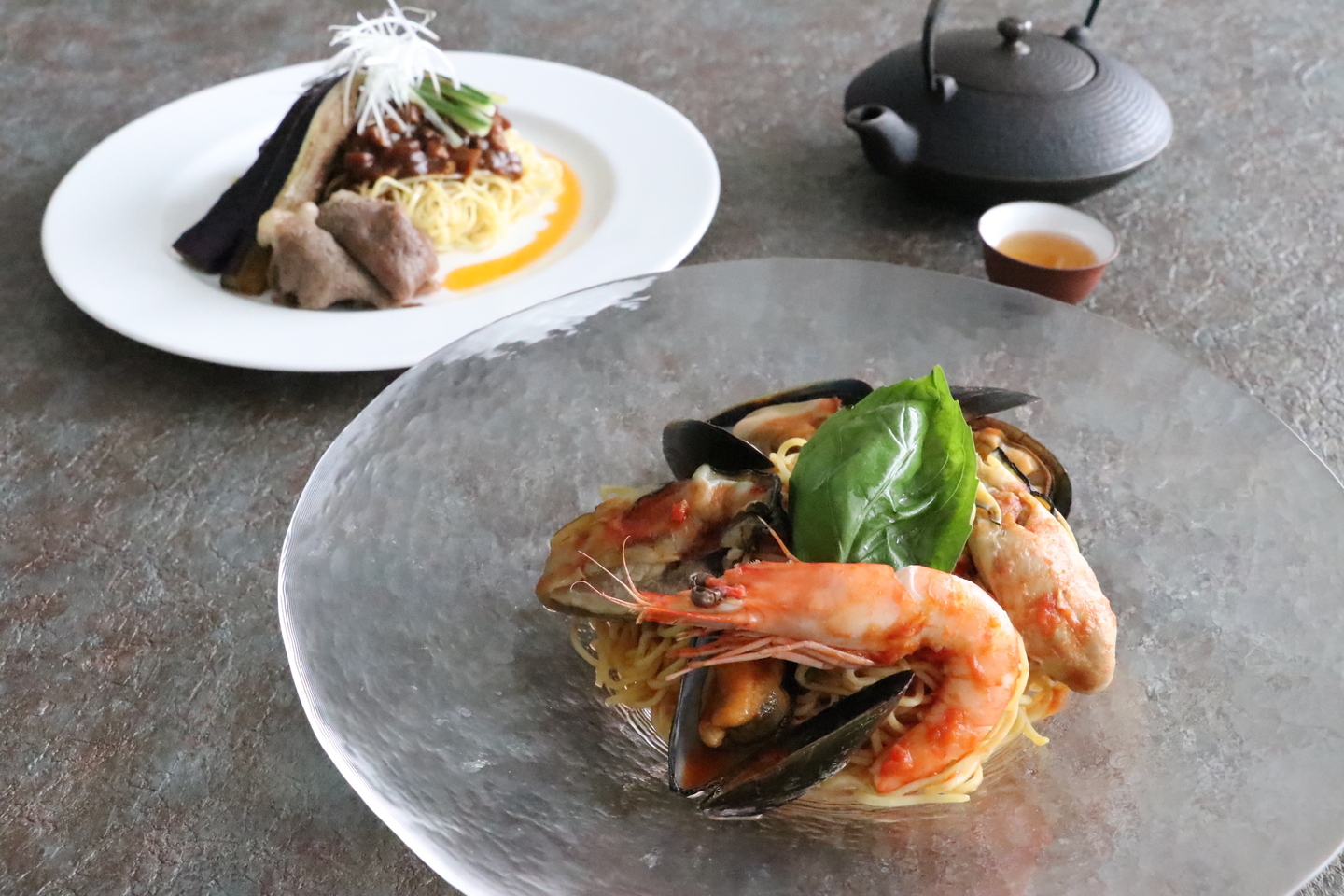 発酵唐辛子「泡辣椒(パオラージャオ)」でピリ辛に仕上げたコクと甘みのあるトマトスープを麺と和え、旨みが詰まった大粒の広島産牡蠣や有頭海老、ムール貝を贅沢にのせた一品で、見た目はイタリア料理風でもありますが、味わいは本格的な中国料理です。