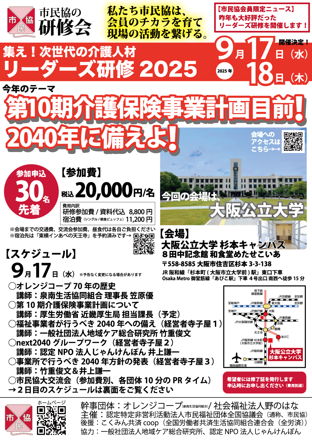 介護系事業者900団体の会員を有し、身近な地域での助け合い・支え合い、優しい福祉のある地域社会づくりを推進している認定特定非営利活動法人市民福祉団体全国協議会(本社:東京都新宿区、代表理事:鷲尾公子・とよしま亮介、略称市民協)は、会員のチカラを育て、現場の活動を繋げるため、2025年9月17日から18日にかけて、リーダーズ研修2025in大阪「第10期介護保険事業計画目前!2040年に備えよ!」を開催します。