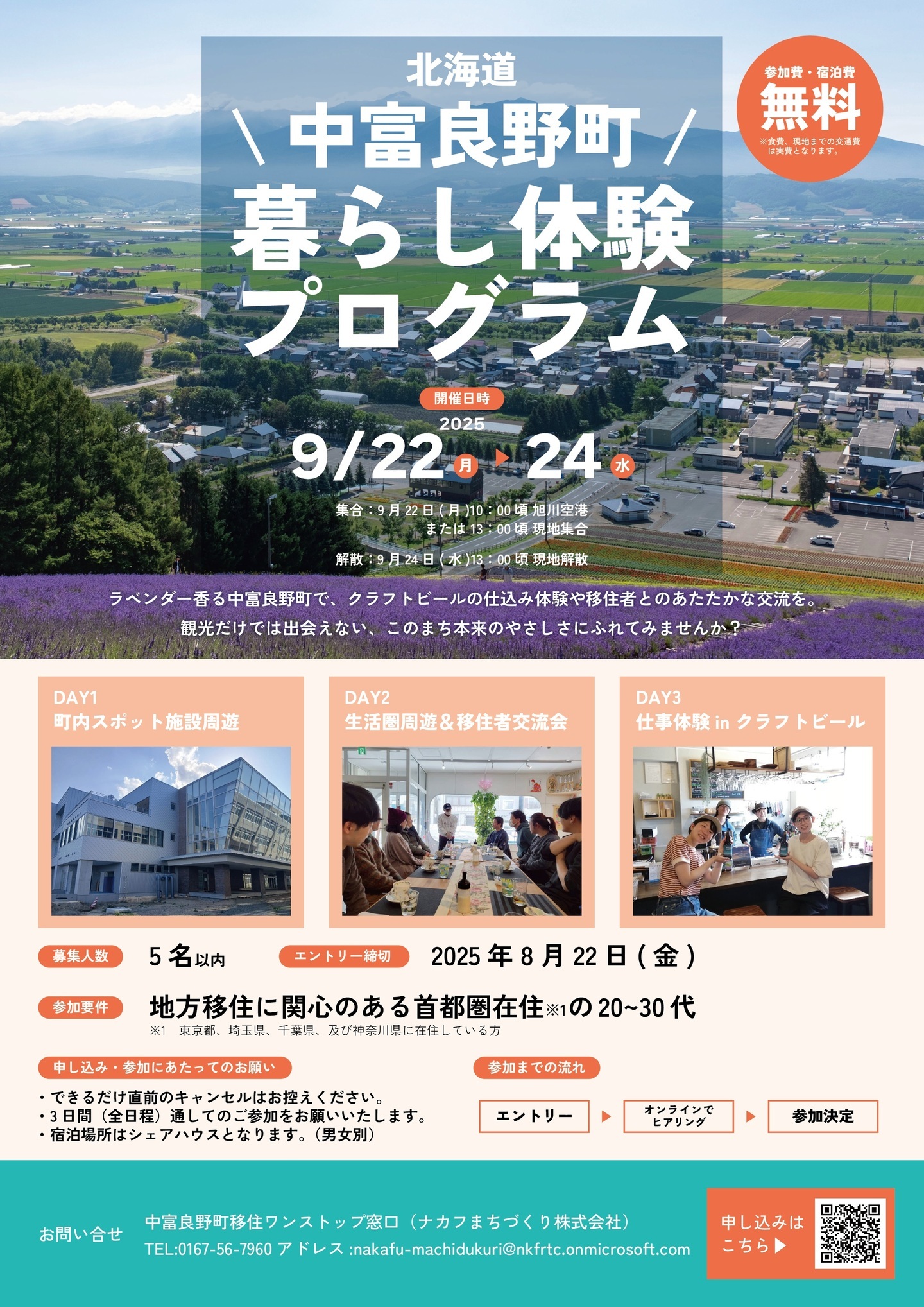 北海道のほぼ中央、富良野盆地にある「ラベンダーのまち」中富良野町(町長:小松田清)では、地方移住に興味を持つ首都圏在住の20~30代を対象に、2025年9月22日(月)〜24日(水)の3日間、「暮らし体験プログラム」を開催します。町役場やコワーキングスペース、8月に落成したばかりの注目の義務教育学校「ラベンダーの杜 中富良野町立なかふらの学園」校舎の見学や、スーパーやカフェ、ラベンダーで有名な観光スポットなどを巡るほか、生活圏である富良野エリアも視察し、移住者や地元町民とのジンギスカンを囲んだ交流も行います。最終日には中富良野町のおいしい水や農作物を原材料に作られた”なかふらの” らしいクラフトビールの仕込み体験も!少人数制(5名以内)で、単なる観光では得られない中富良野町の暮らし「ナカフライフ」を存分に楽しめるプログラムです。