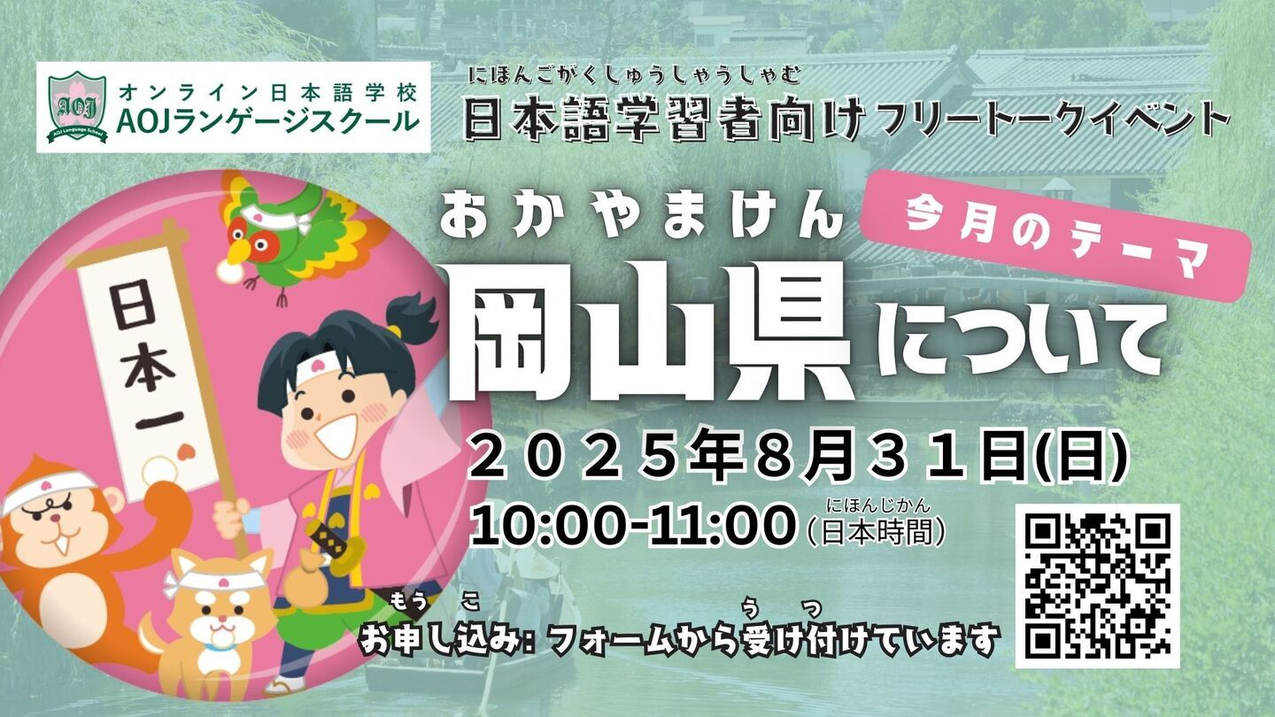 オンライン日本語学校「AOJランゲージスクール」運営、日本語能力試験学習サイト「Attain Online Japanese」運営、日本語能力試験対策eラーニング制作のアテイン株式会社(本社:東京都江東区、電話:03-6381-8641)は、日本語学習者向けのオンラインフリートークイベント「日本語で話そう!」8月31日(日)10:00〜11:00に開催します。日本語学習者同士で、テーマに沿って日本語での会話練習を行うことができるイベントです。今回のテーマは「岡山県について」です。お申し込みはフォームより受け付けています。日本語を練習し、日本が好きな新しい友達を作るこの無料の機会に、ぜひお申し込みください。