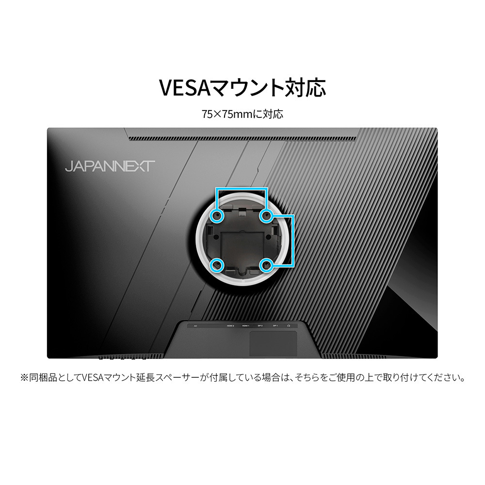 75x75mmのVESAマウントに対応、別売のモニターアームやモニタースタンドなどへの取り付けが可能です。また、2Wx2のスピーカーを搭載します。