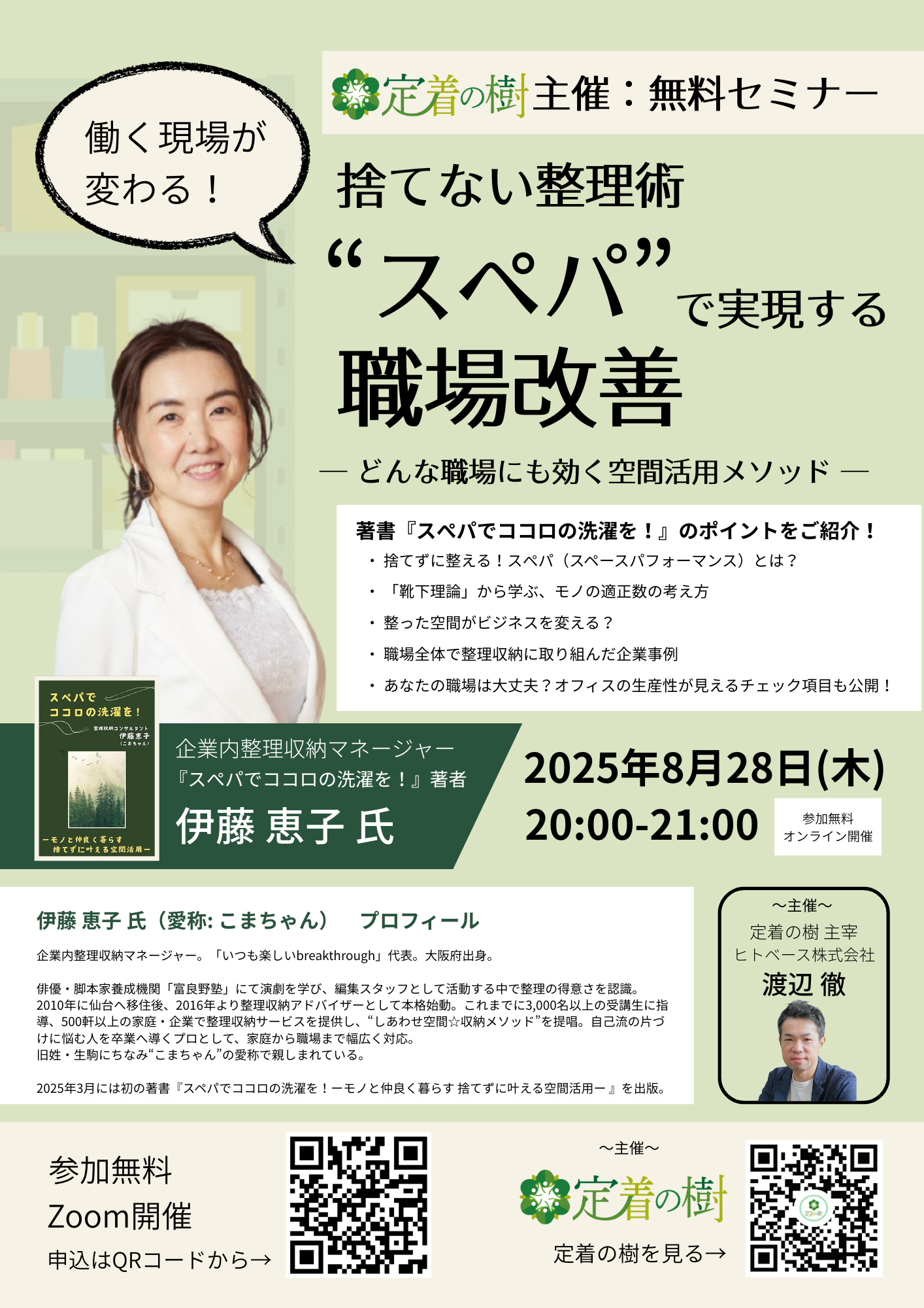 2025年8月28日(木)、ヒトベース株式会社(本社:宮城県仙台市、代表取締役:渡辺徹)は、同社が運営する「定着の樹」主催にて、無料オンラインセミナー「捨てない整理術“スペパ”で実現する職場改善」を開催いたします。