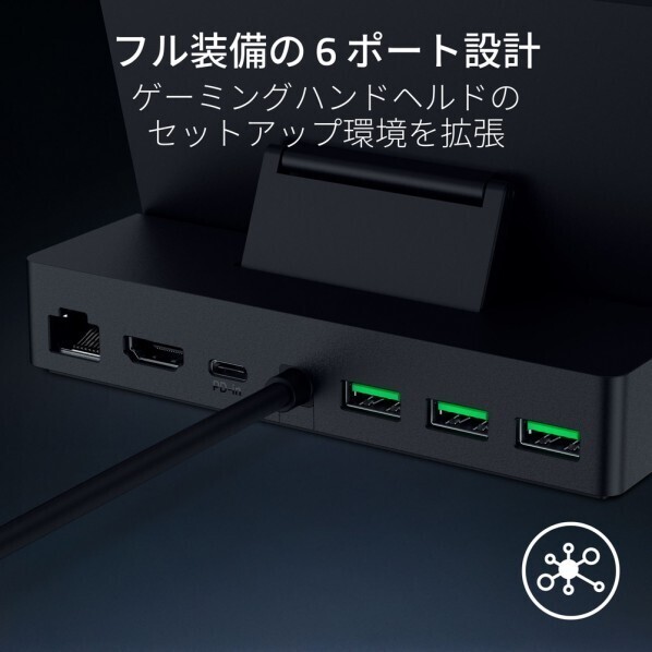 株式会社天空が運営するハイビームAKIBAは、Razer(レイザー)のポータブルゲーミング向けドッキングステーション「Razer Handheld Dock Chroma」を本日よりハイビームAKIBA 秋葉原本店およびハイビーム公式オンラインストアで販売開始します。なお、ハイビームAKIBA 秋葉原本店では実機展示も開始します。Razer Handheld Dock Chromaは、USB-A/USB-C/HDMI 2.0/ギガビットイーサネットに対応する6-in-1ポータブルゲーミングドックです。USB-C Power Delivery(PD)入力は最大100W、接続デバイスへの給電は最大85Wに対応。HDMI 2.0による4K@60Hz出力、2段階(45°/75°)の折りたたみ式スタンド角度調整、Chroma RGBライティングを備え、ハンドヘルドの据え置き利用をスマートに拡張します