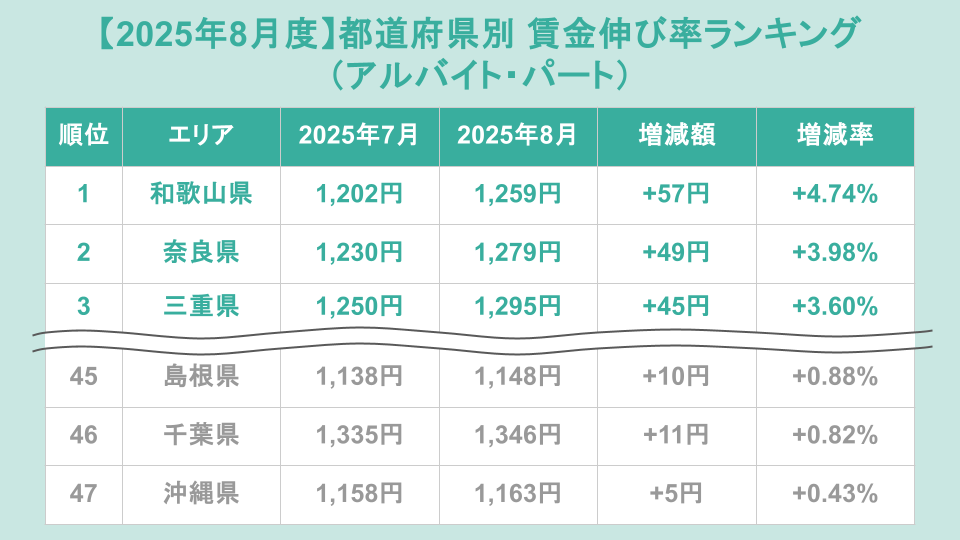 求人サイト主要9媒体から雇用形態別に分析!アルバイト・パートでは和歌山県が前月比+4.74%で1位【2025年8月度 都道府県別 賃金伸び率ランキング】