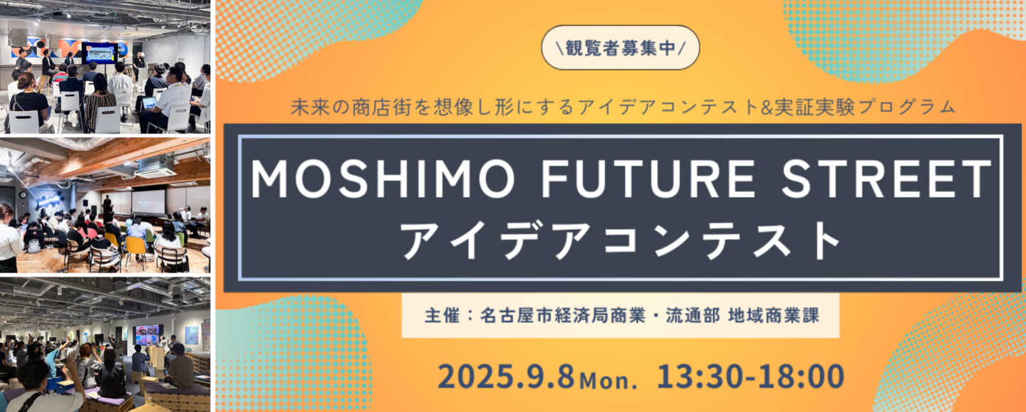 名古屋市(経済局商業・流通部地域商業課)は、未来の商店街のあり方を考え、形にするアイデアコンテスト&実証実験プログラム「MOSHIMO FUTURE STREET(もしもフューチャーストリート)」を実施しています。つきましては9月8日(月)、ナゴヤイノベーターズガレージ(名古屋市中区栄)にて、商店街を舞台に実証実験へ挑戦する優秀提案を選考する「アイデアコンテスト」を開催します。AIやブロックチェーン、VR、ARなどの先進技術と、食・健康・演劇・教育などを掛け合わせ、商店街の課題解決に挑む8つのアイデアが発表される予定です。