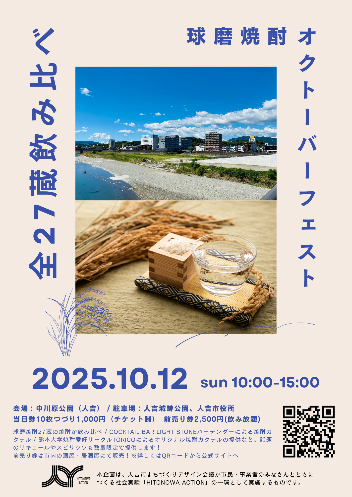 10月12日(日)10:00〜15:00に中川原公園(熊本県人吉市)にて、球磨焼酎オクトーバーフェストを開催いたします。現存する球磨焼酎27蔵の焼酎を一度に飲み比べできるだけでなく、地元バーテンダーによるリキュールの提供や、熊本大学の学生らによるオリジナルカクテルも提供されます。また、同日に人吉球磨のインフルエンサー「人吉球磨めし」が主催する球磨川マルシェを共同開催します。