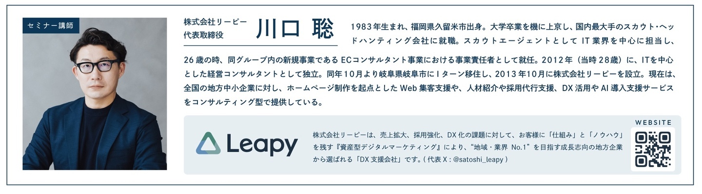 株式会社リーピー(本社:岐阜県岐阜市、以下:当社) 代表取締役 川口 聡は、2025年10月17日(金)に岐阜信用金庫(本店:岐阜県岐阜市)主催の「AIを活用した最新採用ノウハウセミナー」に登壇します。近年急速に発展している生成AIは、採用担当者のルーティン業務を劇的に効率化し、候補者とのコミュニケーションを最適化するなど、採用プロセス全体に革新をもたらす可能性を秘めています。本セミナーでは、広告費に頼らず安定的に応募者を獲得する仕組みと、生成AIを採用活動に活かす具体的なノウハウを解説します。さらに、当日は個別相談会も実施し、さまざまな業界の企業様の採用課題に対応いたします。