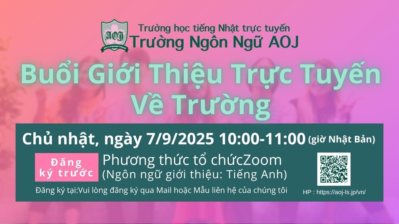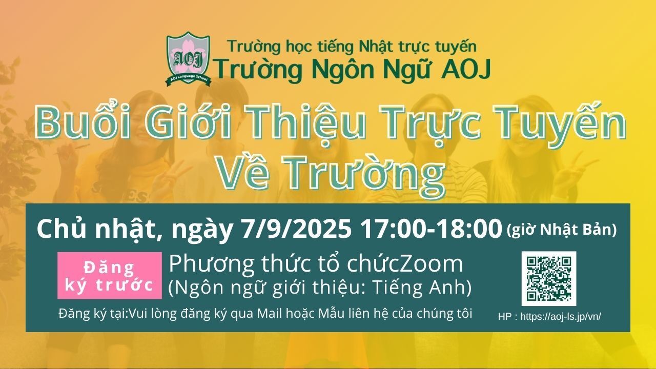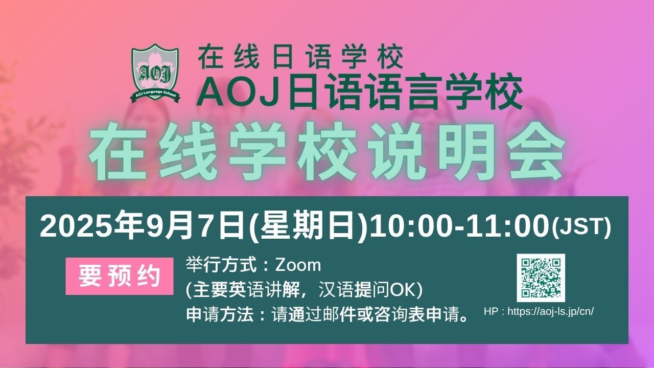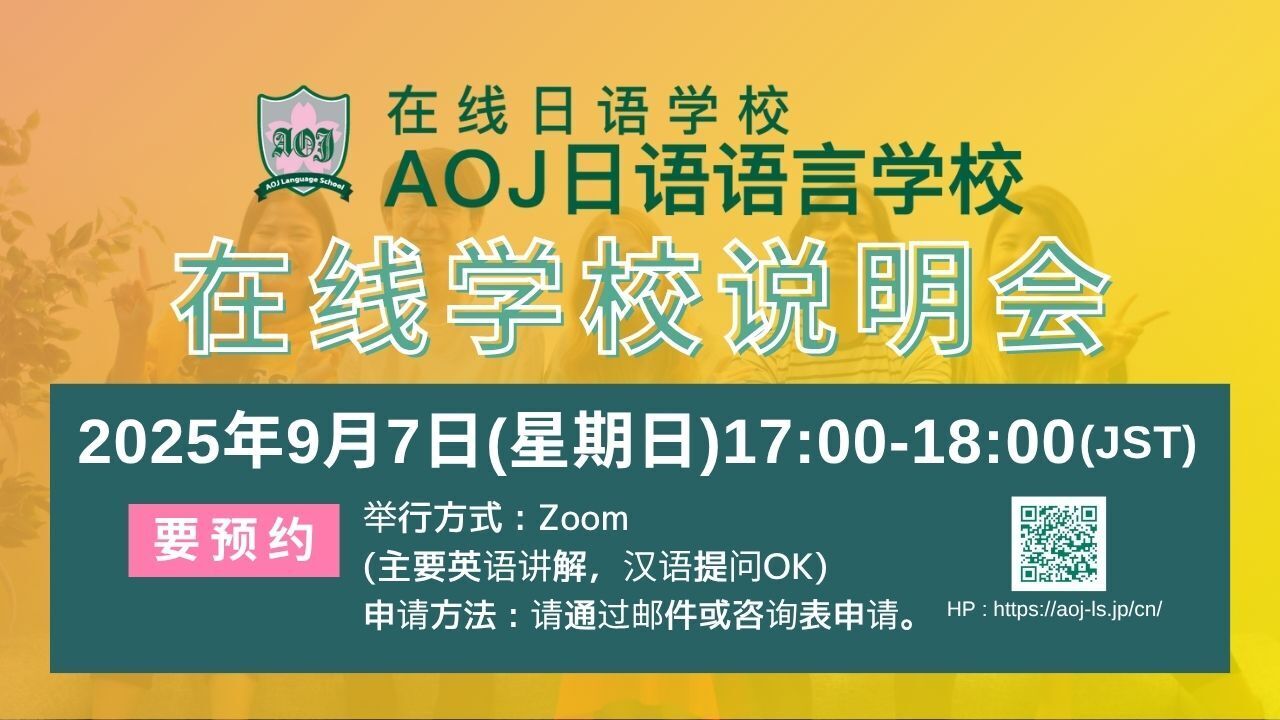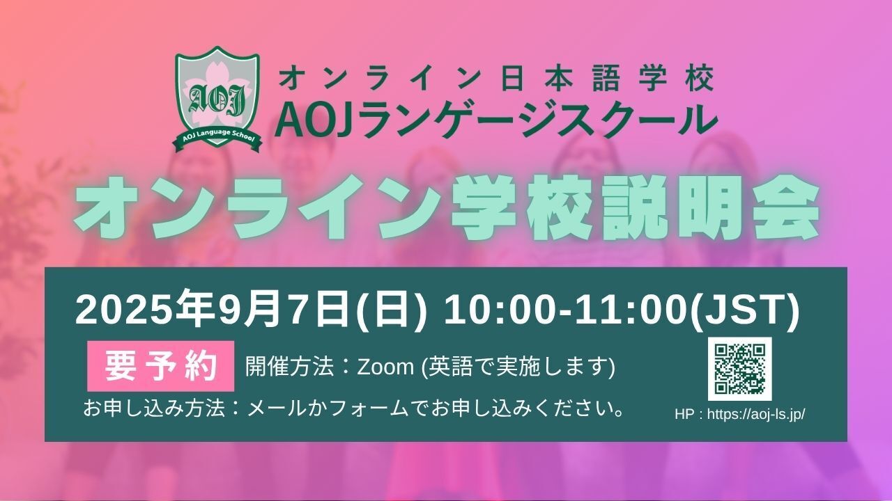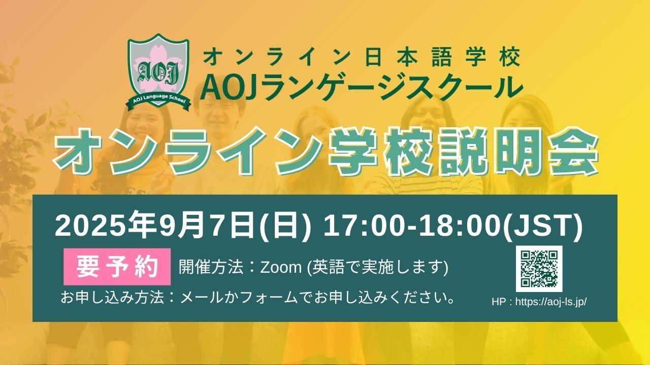 オンライン日本語学校AOJランゲージスクールにて、2025年秋学期開講に向け、第2回オンライン入学説明会を日本時間9月7日(日)17:00-18:00に開催します。参加には事前申し込みが必要です。HPより承っておりますので、是非お申し込みください。お申し込みフォーム:https://forms.gle/wh9FpybyERfgU8CMA