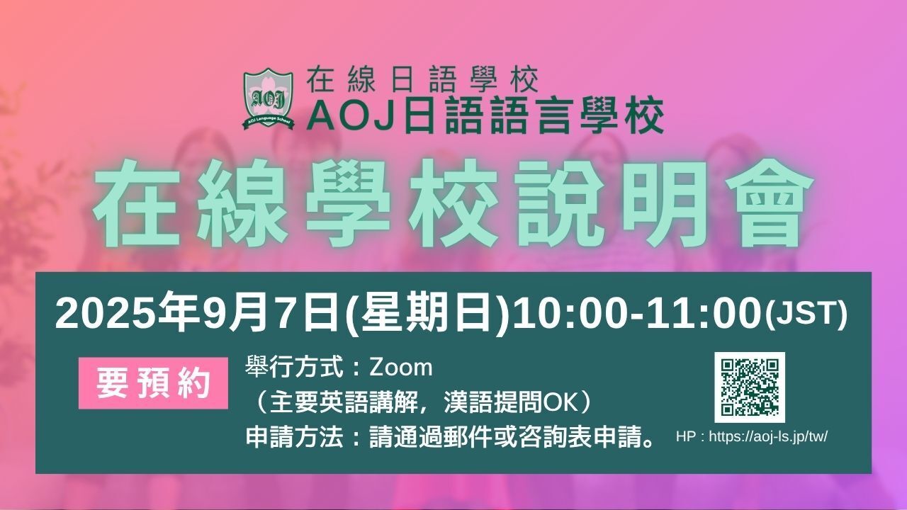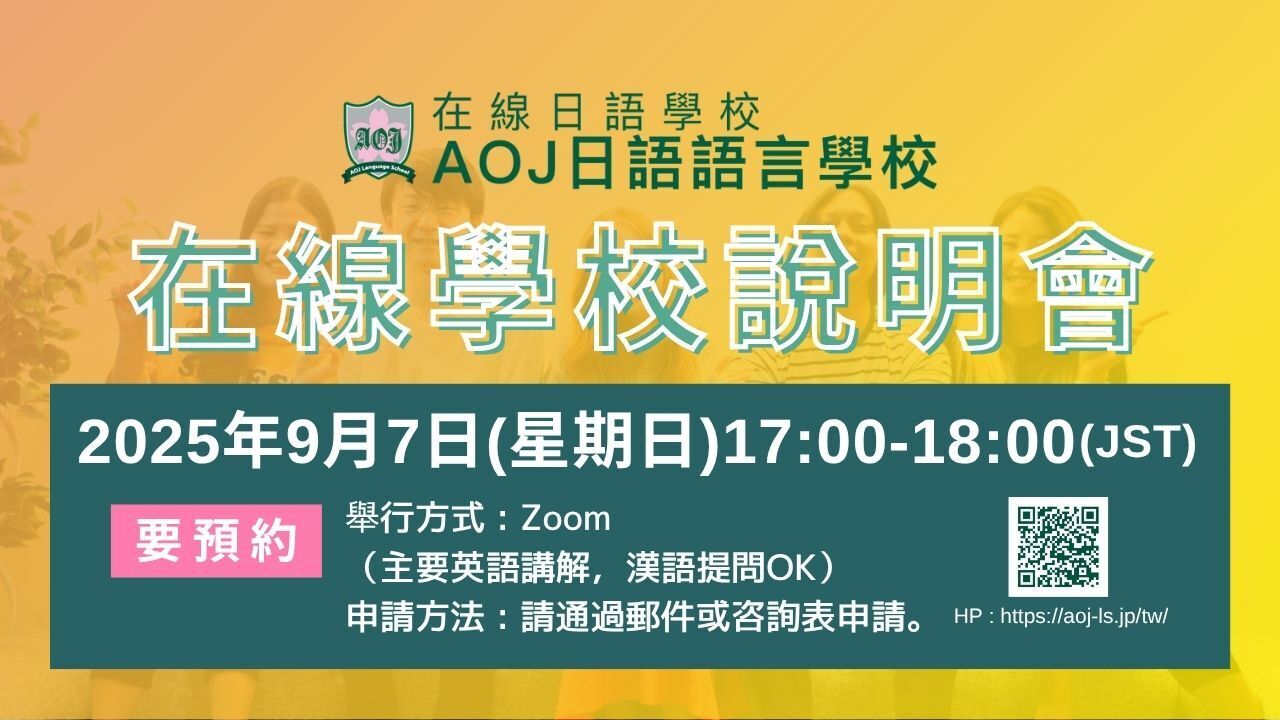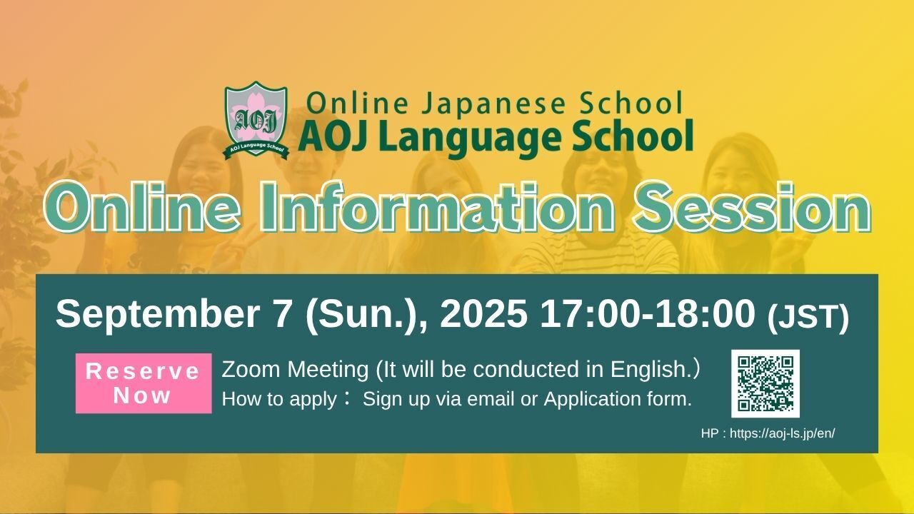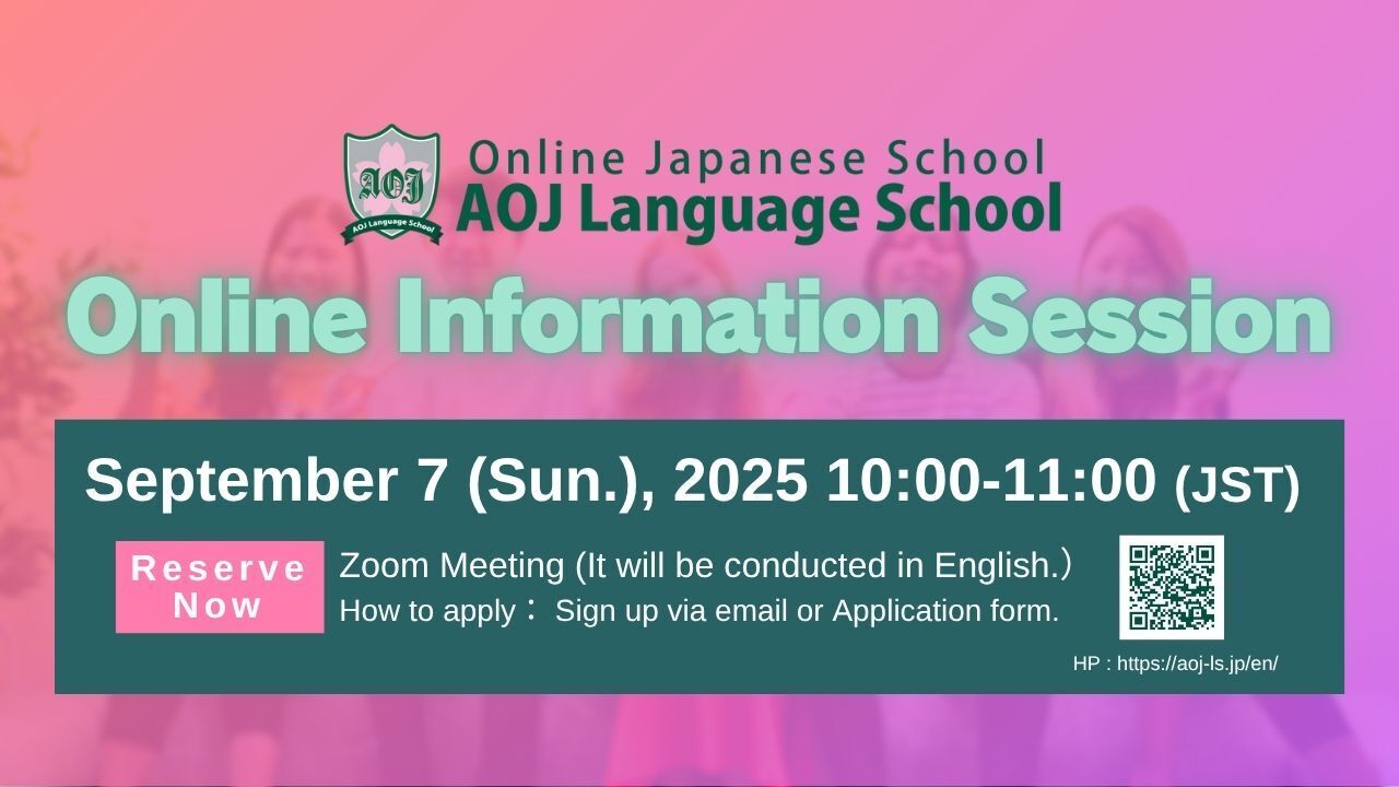 オンライン日本語学習サイト(Attain Online Japanese)運営、eラーニング制作のアテイン株式会社(本社:東京都江東区、電話:03-6381-8641、代表 福嶌崇臣、資本金1億1470万円)が運営するオンライン日本語学校AOJランゲージスクールにて、2025年秋学期開講に向け、第2回オンライン入学説明会を日本時間9月7日(日)17:00-18:00に開催します。参加には事前申し込みが必要です。HPより承っておりますので、是非お申し込みください。