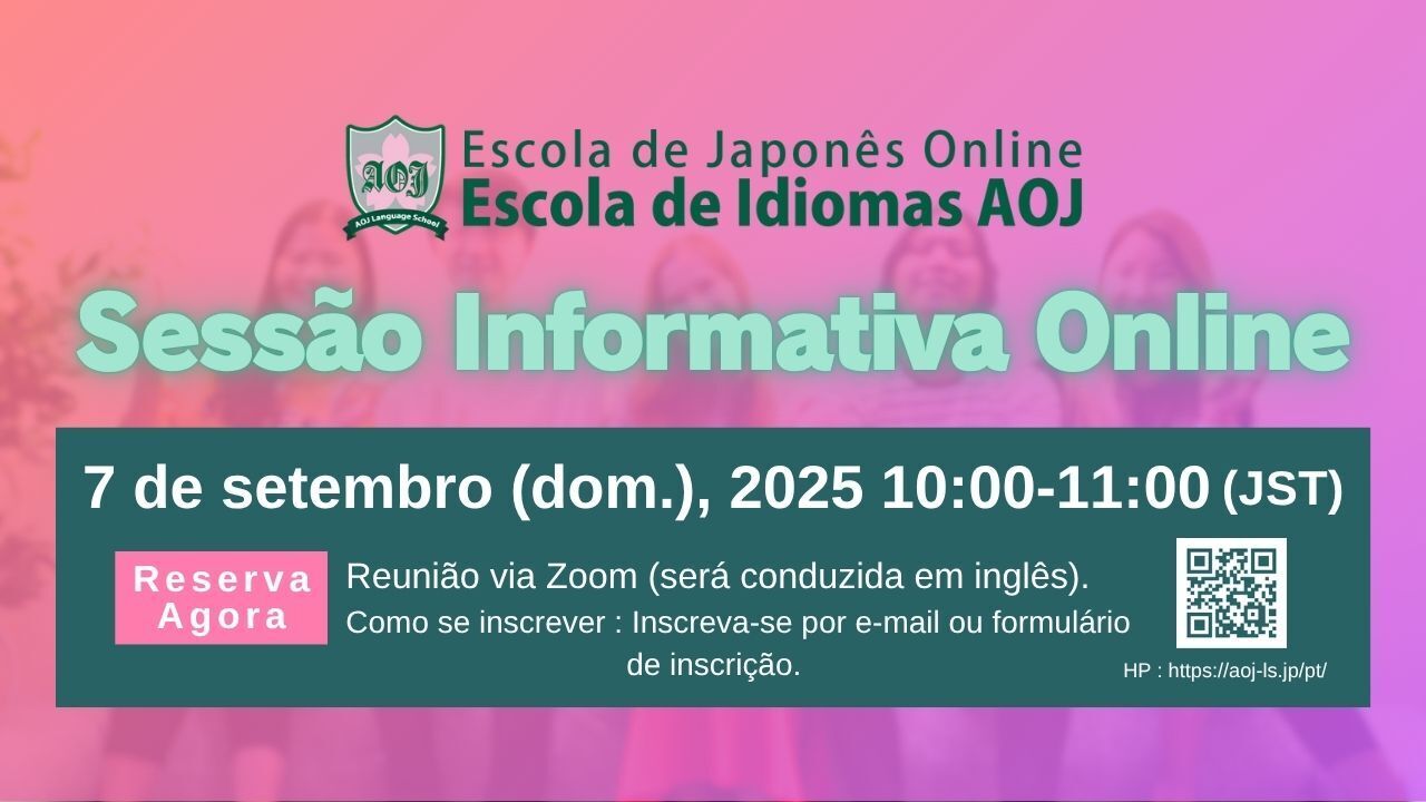 学校説明会では、AOJランゲージスクールについてのカリキュラム・学校スケジュール、コースの概要、入学案内と入学キャンペーンについて説明します。特に、2024年11月より日本語オンデマンド教材をポルトガル語でも提供開始したこともあり、教材やライブ授業について多くの反響をいただいております。説明会では学校関係者に直接質問できる良い機会となっております。