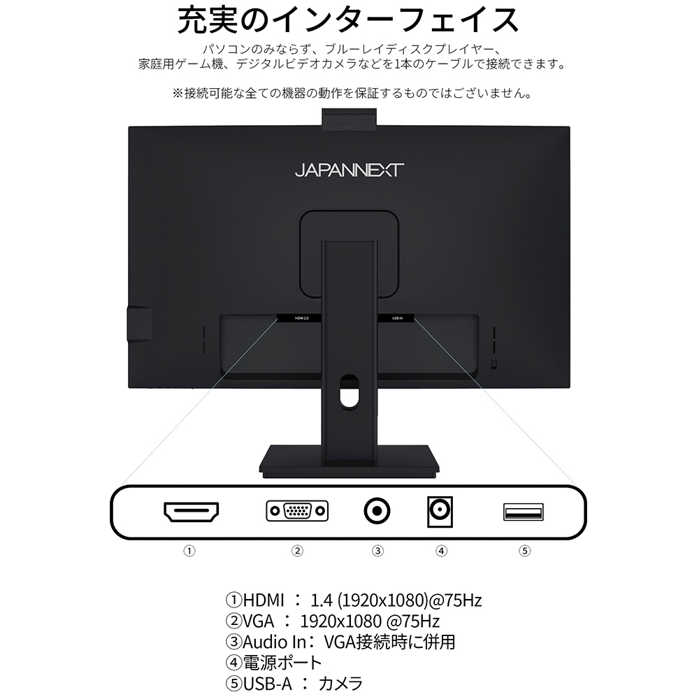 インターフェイスは、HDMI 1.4 x1 (75Hz)とVGA x1 (75Hz/オーディオ入力と併用可能)を1つ搭載しています。VGA端子を搭載していますので以前から使用しているPCなどとの接続も可能です。