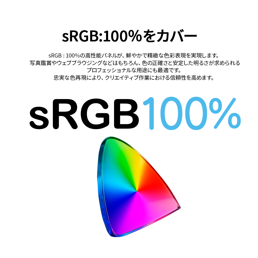 あらゆる角度から見ても色やコントラストの変化がおきにくいIPSパネルを搭載し、広視野角上下左右178°を実現します。最大輝度250cd/m2の液晶パネルは、sRGB:100%の広色域に対応し、動画や写真も色鮮やかに美しく表示します。