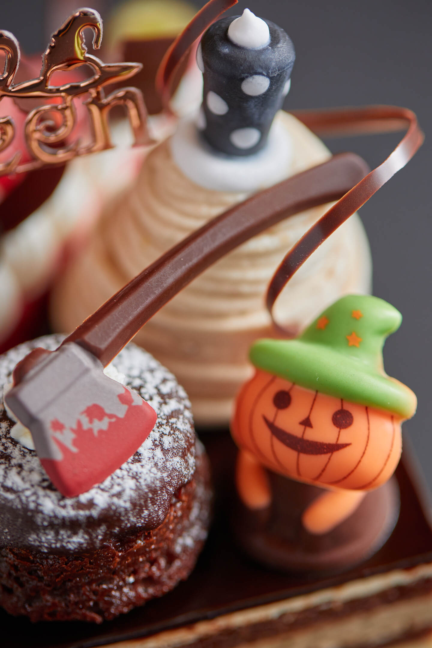 このケーキの最大の魅力は、ケーキ1台で2つの味が楽しめるアソートスタイル。甘酸っぱいベリームースと、ほろ苦いコーヒーの香る濃厚ガトーオペラを組み合わせた特別仕様。それぞれにこだわり抜いた2層構造のケーキを一体にし、その上にハロウィンモチーフのプティガトーを贅沢にトッピングしました。