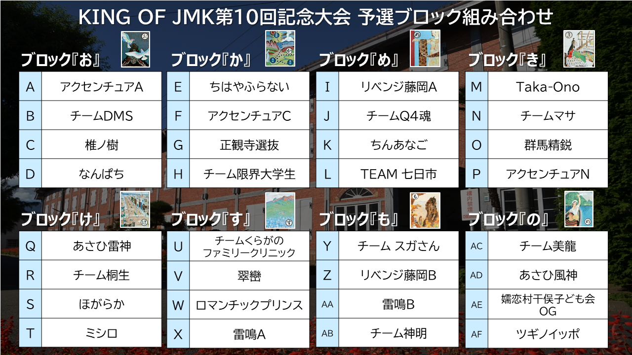 一般社団法人KING OF JMK(代表理事:渡邉 俊)は令和7年10月11日(土)に世界遺産:富岡製糸場 西置繭所多目的ホールで『KING OF JMK 第10回記念大会~おとな達の上毛かるた世界一決定戦~』を開催致しますが、参加する32チームの予選ブロック組み合わせが決定致しましたのでお知らせします。世界初の、世界遺産で開催する上毛かるたの世界一決定戦です。当日は是非現地にお越しいただき、一緒に上毛かるたを盛り上げていただけると幸いです。