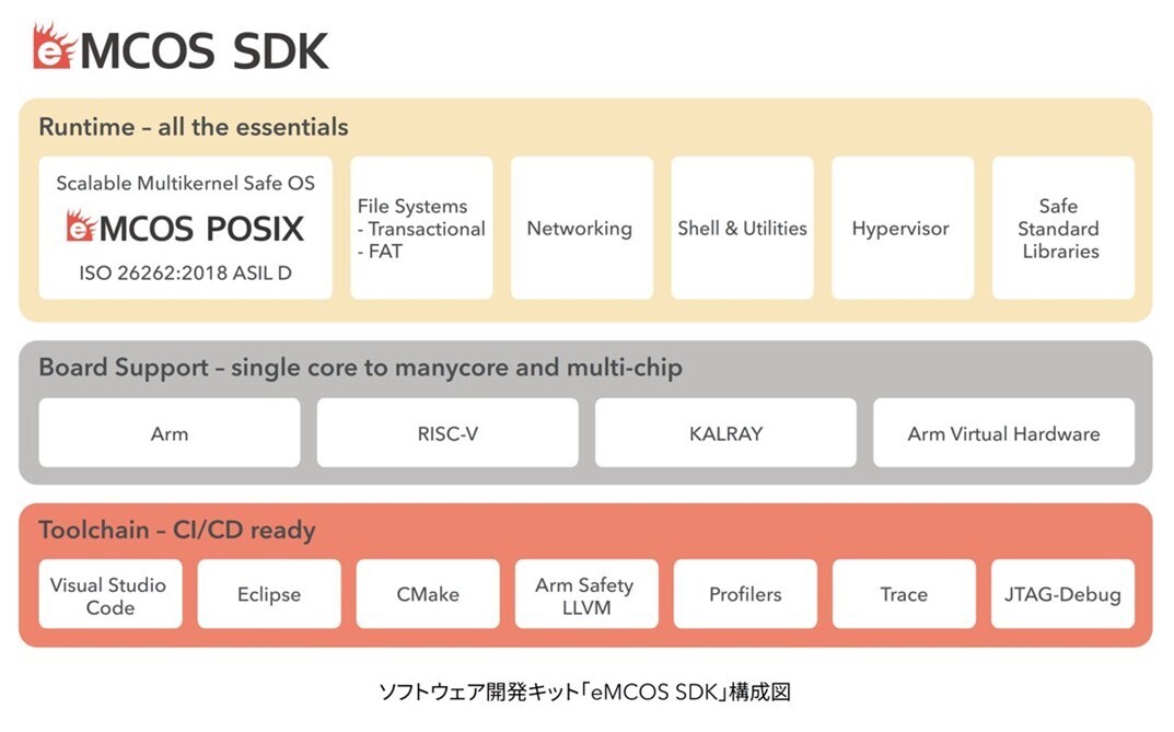 eMCOS POSIXは、マルチカーネルアーキテクチャを採用した商用RTOS(リアルタイムオペレーティングシステム)として世界に先駆けて認証を取得しました。次世代の半導体に対応したマルチカーネルアーキテクチャを採用し、システムの複雑さによらず安定した高い性能と安全性を兼ね備えたeMCOS POSIXは、SDx時代のミッション・クリティカルなシステム*[1] に最適です。そして、組込み分野で豊富な実績を持つeSOLは、ソフトウェアを基軸としたモノづくり(SDx)において、このeMCOS POSIXを始めとしたプロダクトと、OS・ミドルウェア・プラットフォーム・アプリケーション・設計開発ツール、機能安全開発プロセスなど、各分野のエキスパートによる包括的なワールドクラスのフルスタックエンジニアリングサービスによってお客様のニーズに柔軟に応えることができ、高度化するSDx時代のシステム設計・開発において競争力のあるシステム開発をトータルで支援します。