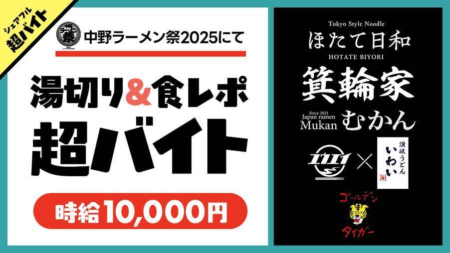 「はたらいて、笑おう。」をビジョンに掲げるパーソルグループのスキマバイトアプリ『シェアフル』やSaaSシフト管理サービス『シェアフルシフト』、就業実績を活用した人材紹介サービス『シェアフルエージェント』などを提供するシェアフル株式会社(本社:東京都港区、代表取締役社長:横井 聡)は、2025年9月20日(土)~9月28日(日)に中野四季の森公園で開催される「中野ラーメン祭2025」へ協賛いたします。これに伴い、イベント内でラーメンの湯切り体験超バイト、6店舗のラーメンの食べ比べをする食レポ超バイトを募集します。