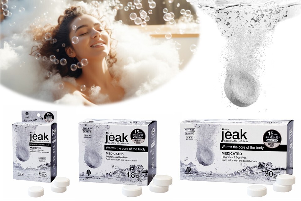 重炭酸・機能性入浴剤「薬用 jeak(ジーク)」を新発売。白いタブレットを1回に3錠使用。炭酸水素Naによる重炭酸イオンが、お湯に24時間溶け込みます。