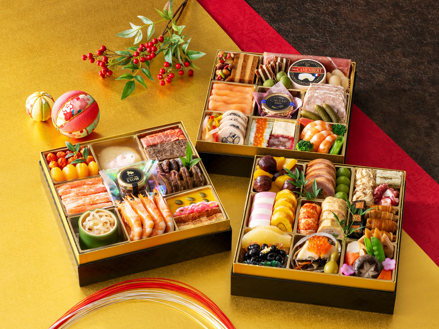 三段のお重に美しく並ぶのは、和・洋・中の各シェフたちが、厳選された高級食材を贅沢に使用しひとつひとつ丁寧に作りあげたおせちの数々。