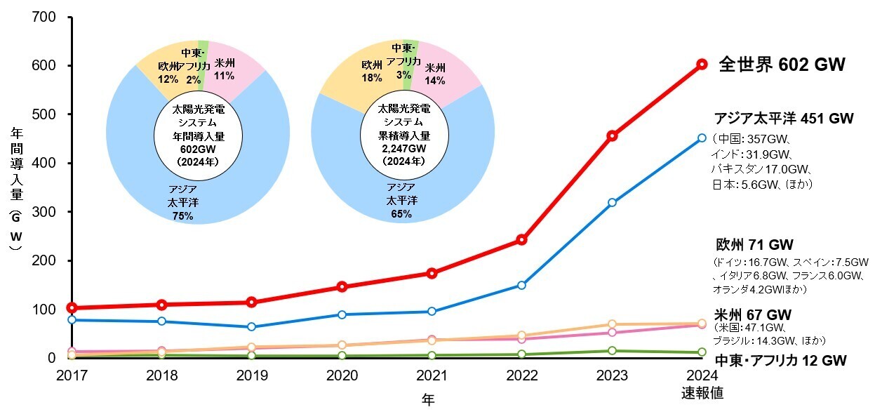 2024年、世界の太陽光発電システム年間導入量は前年比32%増の602 GWに達し、累積導入量は2022年の1TW到達からわずか2年で2TWを突破しました。脱炭素社会実現に向けた政策、PPAや入札の拡大、発電コスト低下が成長を後押しし、太陽光発電は「2020年代の新設電源の“キング(王)”」として力強い拡大を続けています。太陽電池の年間生産量も750 GWを超え、世界の太陽光発電産業は、年間市場TW時代を見据えたビジネス展開と技術開発がより一層活発化する大転換期に突入しています。
