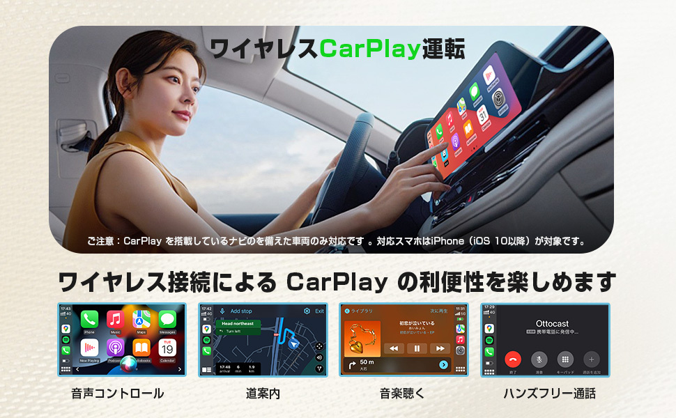 ナビゲーション、地図、電話、メッセージ、LINE、音楽など、多彩なアプリを大画面で快適に利用できます。ワイヤレス接続により、車内でのエンターテインメント体験を大きく拡張します。