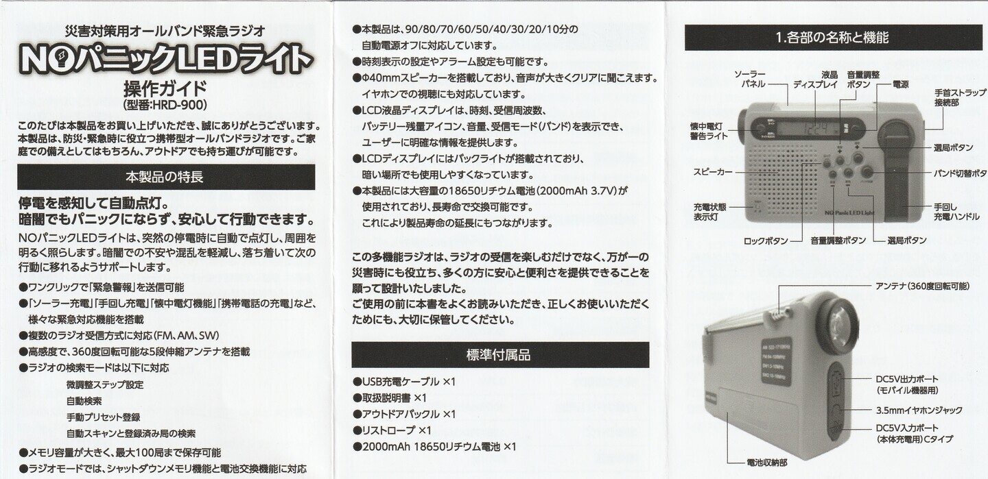 「命を守る」思いの防災用(兼アウトドアー用)LEDライト開発の始まりは、6年前見つけた小指の先ほどの「マイクロリレー」で、市販の小型軽量ラジオ付きライト「漢栄龍社製-モデルHRO-900」に、「LEDライト」で意匠登録した「停電を感知し、自動点灯する」機能を組み入れた【NOパニックLEDライト】の開発に成功した。政府有識者会議は、昨年8月以来3回の「巨大地震注意」を発出し、「国民一人一人は覚悟を持って迅速な避難」と注意喚している中、「巨大地震注意」の南海トラフ巨大地震や台風の夜間襲来では、セットし枕元近辺に置いた【NOパニックLEDライト】は、停電を感知・自動点灯し、そのライトをストラップで手に持ち、またはフックで服に装着、両手使いで避難路を確保、一刻も速く安全な場所へ避難を可能にし、また避難後もラジオ・SOSアラーム等の機能で安全と安心が確保出来る。
