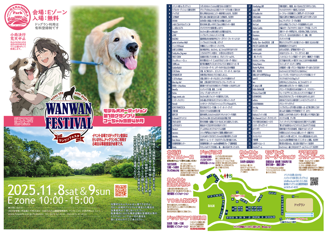 ☆ワンワンフェスタ 2025 日程:11月8日(土)・9日(日) 10:00-15:00場所:千葉県立北総花の丘公園 Eゾーン総面積50haの広域公園。楽しみ方は無限大! 毎年11月に行われているワンワンフェスタ。ドッグランオープニングイベントは2009年から17回目を迎えた。愛犬のお洋服やグッズ、愛犬のおやつやスイーツも。イベント内容は、ドッググッズマーケット、モデル犬オーディション、ドッグヨガ、タイムレース、わんわんゲーム大会など、様々なイベントが行われる。愛犬と1日満喫しよう。