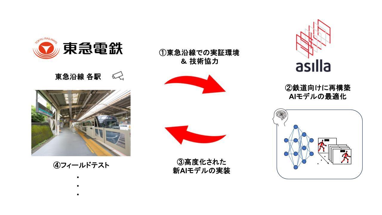 東急グループの中核子会社である東急電鉄株式会社(以下、東急電鉄)とアジラは田奈駅、つきみ野駅を始めとした東急沿線の複数駅において、駅特有の環境に特化したAIモデルの共同開発や、要介護者(白杖利用者、車いす利用者)の検知精度向上に向けた実証実験を実施中となります。