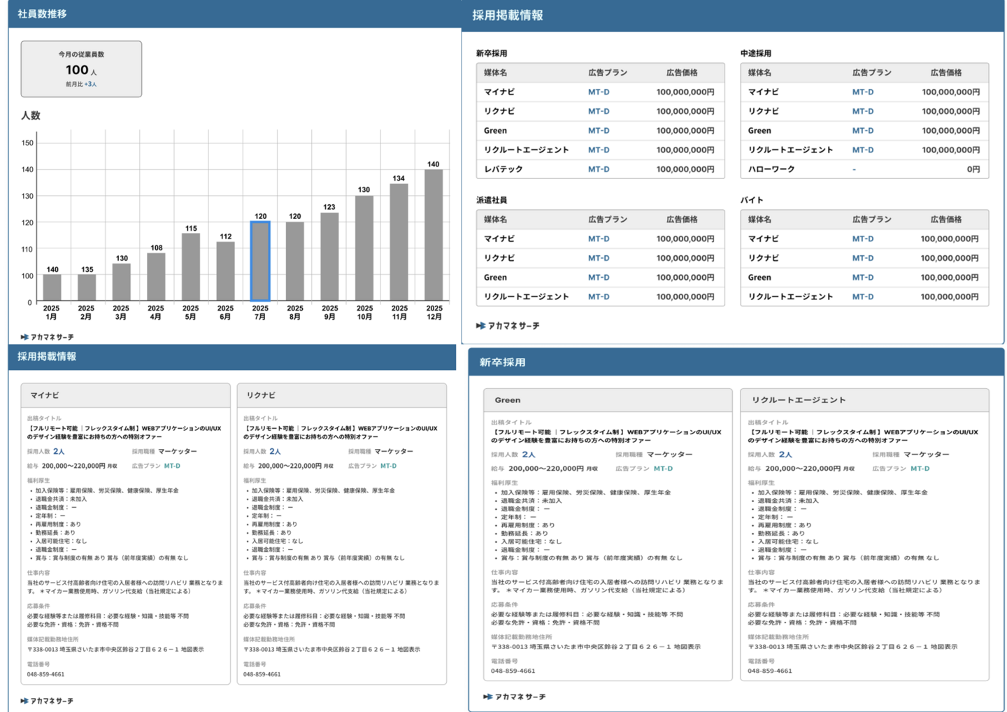 ・採用動向分析:各企業の採用媒体活用状況と募集職種の詳細把握