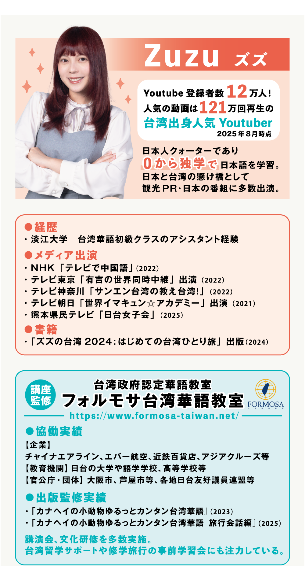 本日2025年10月1日(水)から「台湾で伝わる!ZUZUとマスターする旅の台湾華語入門」の受講予約を開始いたしました。