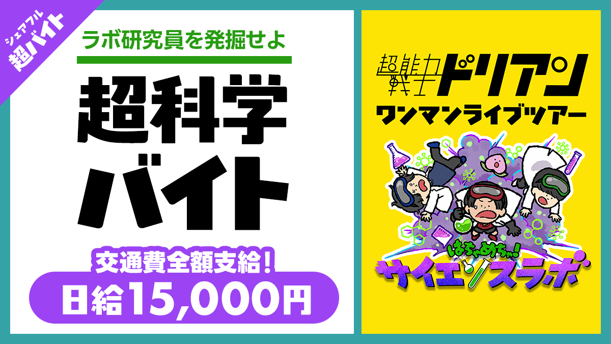 2025年10月26日(日)「超能力戦士ドリアン ワンマンライブツアー はちゃめちゃ!サイエンスラボ」なんばHach(大阪公演)にて、科学者に扮して、サイエンスラボ研究員を発掘する超バイトを募集します。
