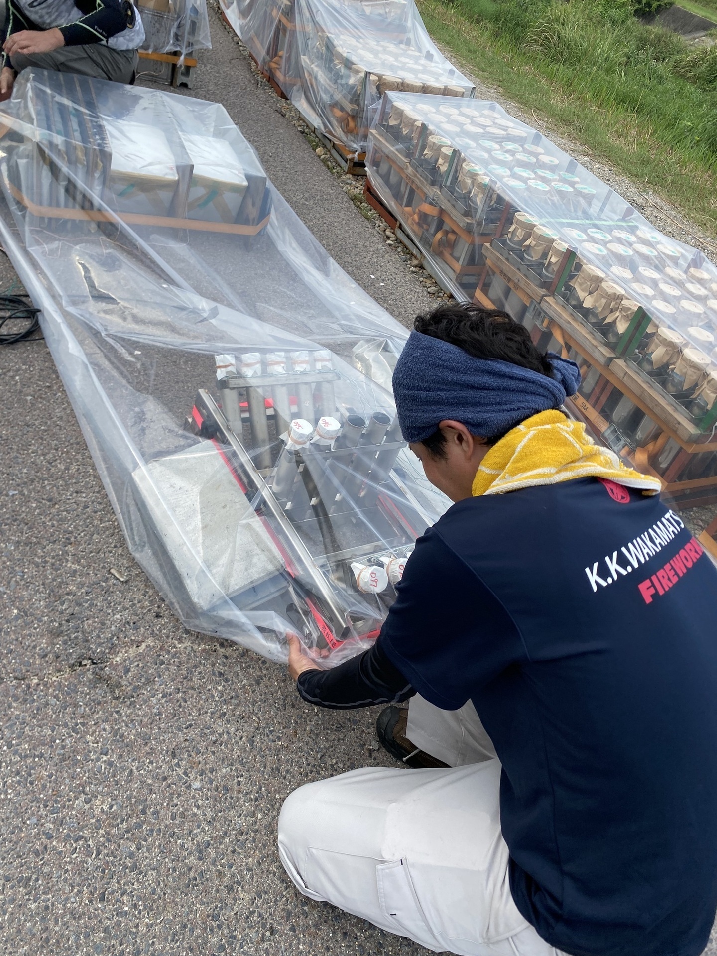 当日の現場は最高気温が31.6度、時折太陽が顔を出しますが、おおむね曇りの1日でした。総勢15名にて作業を行い、雨が降っても花火に影響を及ぼさないようビニールにて防水加工を施しながらの作業となりました。