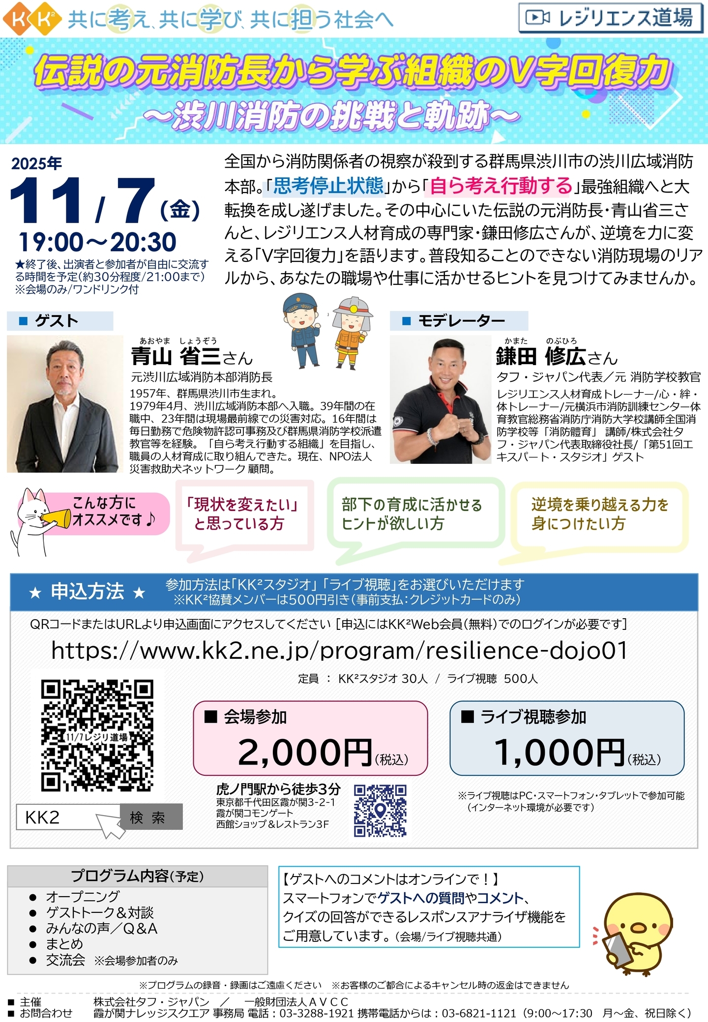 霞が関ナレッジスクエア(略称:KK² 所在地:東京都千代田区 運営:一般財団法人AVCC 理事長:久保田了司)は、2011年の東日本大震災をきっかけに、防災・レジリエンスをテーマにしたプログラムを約70回開催してまいりました。この度、レジリエンスプログラムの一環として『伝説の元消防長から学ぶ組織のV字回復力~渋川消防の挑戦と軌跡~』を開催いたします。