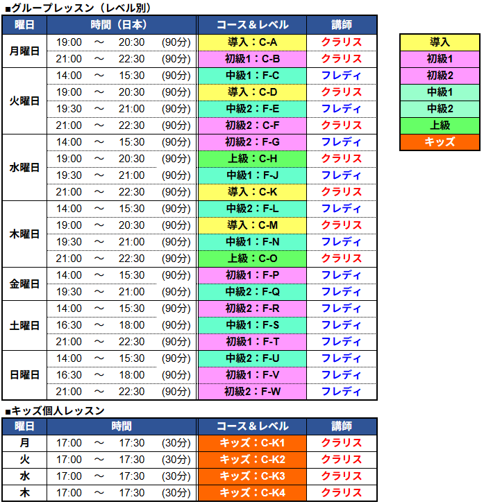 ② 火曜日レッスン(導入、初級2、中級1、中級2、キッズ)